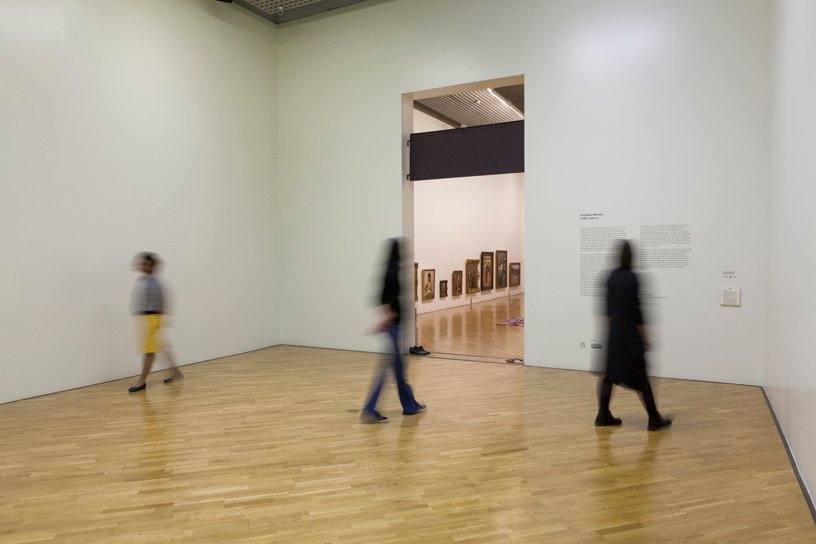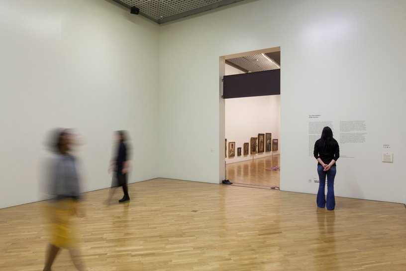 Four speakers installed by the ceiling of an empty room in the museum's upper floor emanate noises made by people walking at that very room, such as steps, grinding and clicking noises, recorded from the room below.